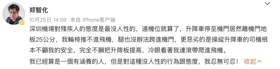 虎撲10月26日訊 知名歌手鄭智化昨日在微博發(fā)文,吐槽深圳寶安機(jī)場無障礙設(shè)施不友好,其乘機(jī)時(shí)遭遇一系列困難,引發(fā)社會廣泛關(guān)注。