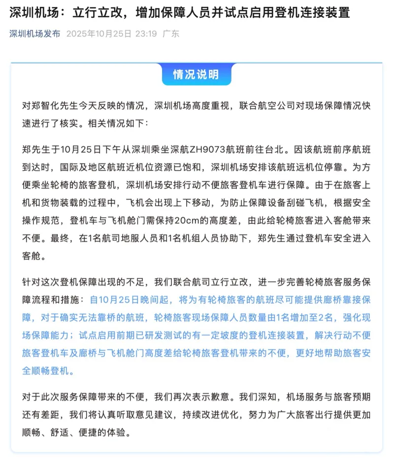針對這次登機(jī)保障出現(xiàn)的不足,深圳機(jī)場聯(lián)合航司立行立改,進(jìn)一步完善輪椅旅客服務(wù)保障流程和措施。自 10 月 25 日晚間起,將為有輪椅旅客的航班盡可能提供廊橋靠接保障,對于確實(shí)無法靠橋的航班,輪椅旅客現(xiàn)場保障人員數(shù)量由 1 名增加至 2 名,強(qiáng)化現(xiàn)場保障能力。同時(shí),試點(diǎn)啟用前期已研發(fā)測試的有一定坡度的登機(jī)連接裝置,解決行動(dòng)不便旅客登機(jī)車及廊橋與飛機(jī)艙門高度差給輪椅旅客登機(jī)帶來的不便,更好地幫助旅客安全順暢登機(jī)。