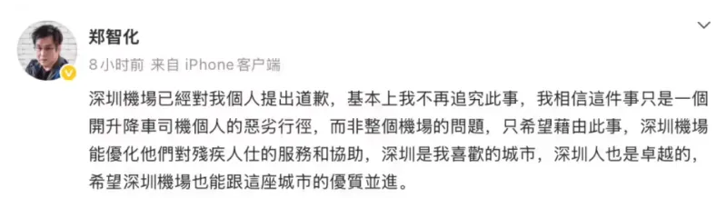 注意到,今天凌晨時(shí),鄭智化表示,“深圳機(jī)場已對他個(gè)人提出道歉,基本上他不再追究此事”。