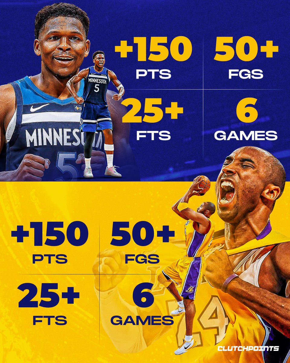 他剛剛與科比-布萊恩特一起成為僅有的兩位在六場(chǎng)比賽中達(dá)成以下數(shù)據(jù)的球員: