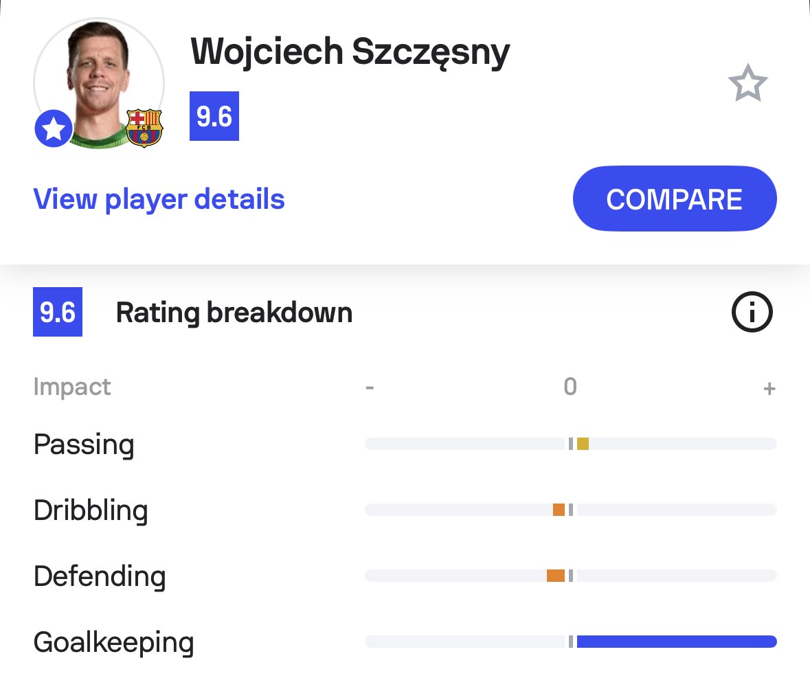 ? 自2017年12月以來,板自國家德比中巴塞羅那球員的最高Sofascore評分(9.6分)