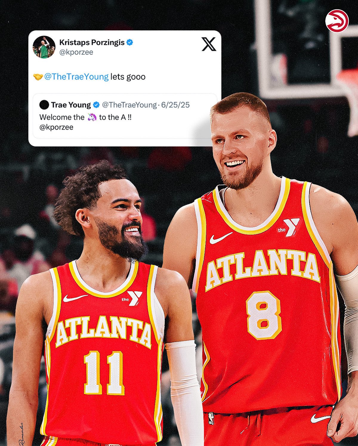 虎撲07月09日訊 老鷹官方更新X,曬出一張老鷹球員特雷-楊和新援克里斯塔普斯-波爾津吉斯的血射享特合成照與球迷分享。