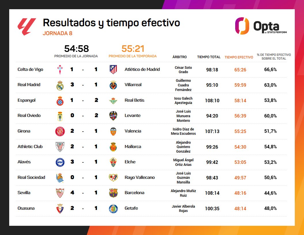 來(lái)源:X虎撲10月06日訊 數(shù)據(jù)網(wǎng)站Opta統(tǒng)計(jì)了本輪西甲比賽的有效時(shí)間。