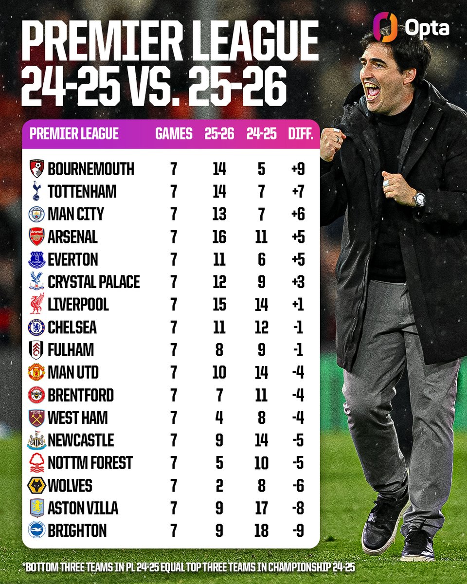 (相同賽程:即面對(duì)相同比賽時(shí)的拿分。如伯恩茅斯本賽季主場(chǎng)2-1擊敗布萊頓,但上賽季他們主場(chǎng)1-2告負(fù),那么本賽季伯恩茅斯計(jì)為+3,布萊頓則計(jì)為-3)