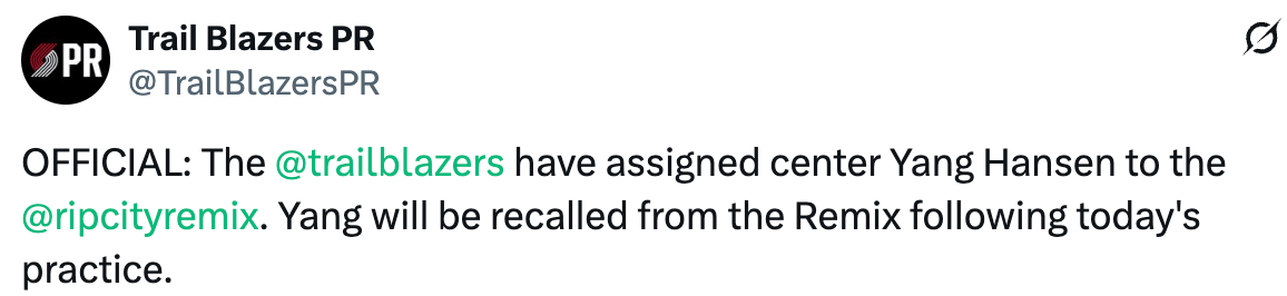 虎撲11月05日訊 開拓者今日官方宣布,他們已經(jīng)將球隊新秀楊瀚森下放到發(fā)展聯(lián)盟撕裂之城混音隊。官方