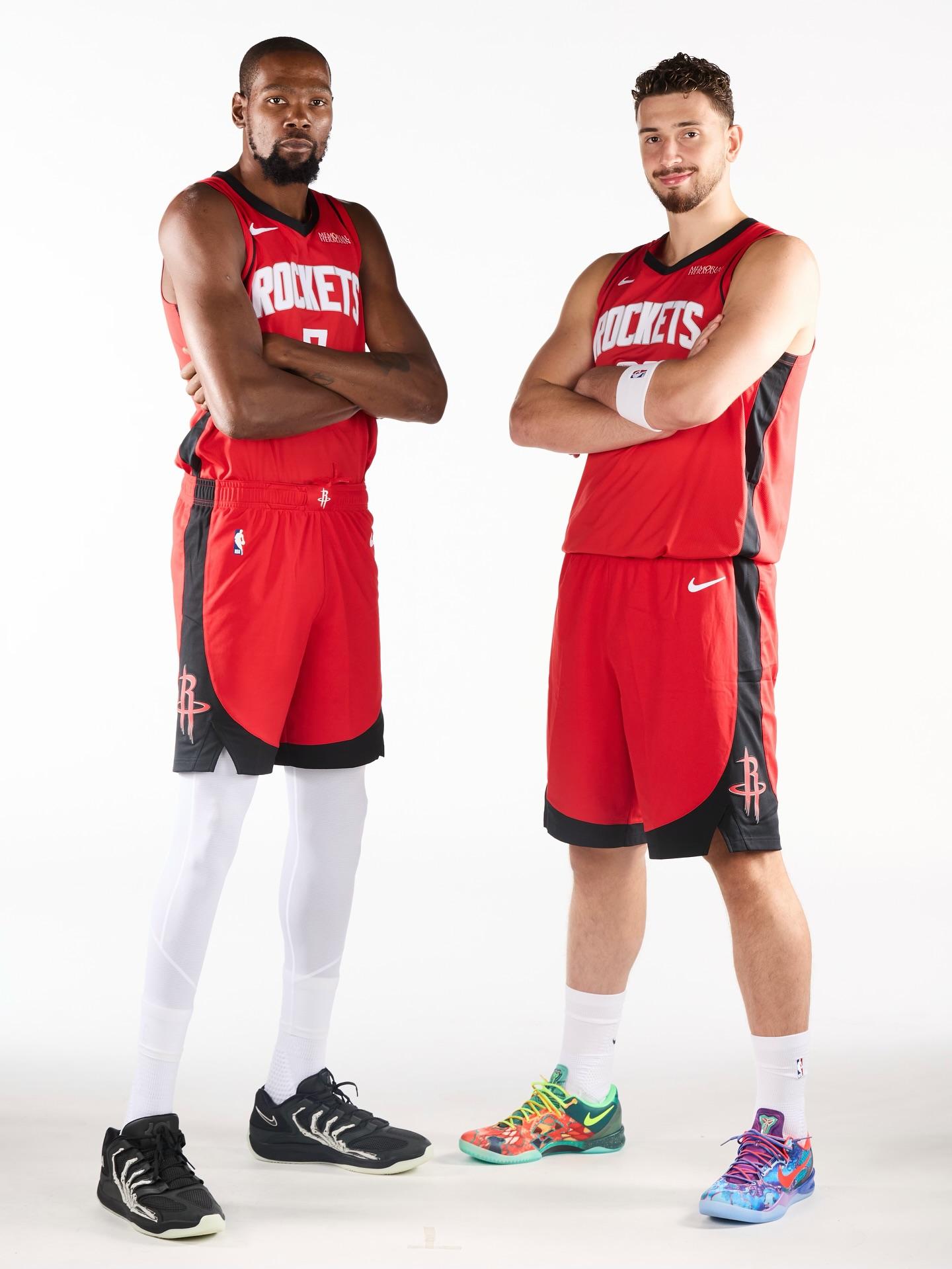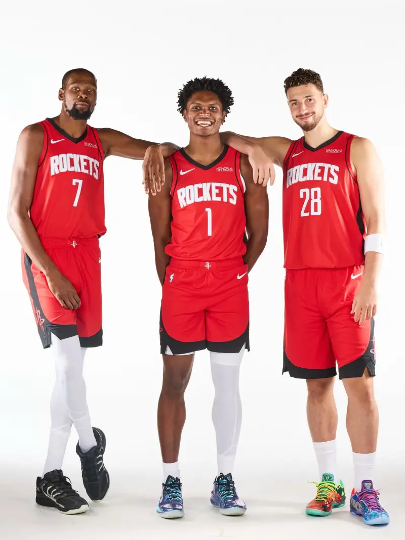 虎撲09月30日訊 火箭官方更新Ins,曬出一組火箭球員阿門-湯普森,箭官阿爾佩倫-申京和凱文-杜蘭特在媒體日上的門杜照片與球迷分享。
