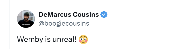 前NBA球員德馬庫斯-考辛斯發(fā)推點評:文班亞馬太不可思議了。馬太