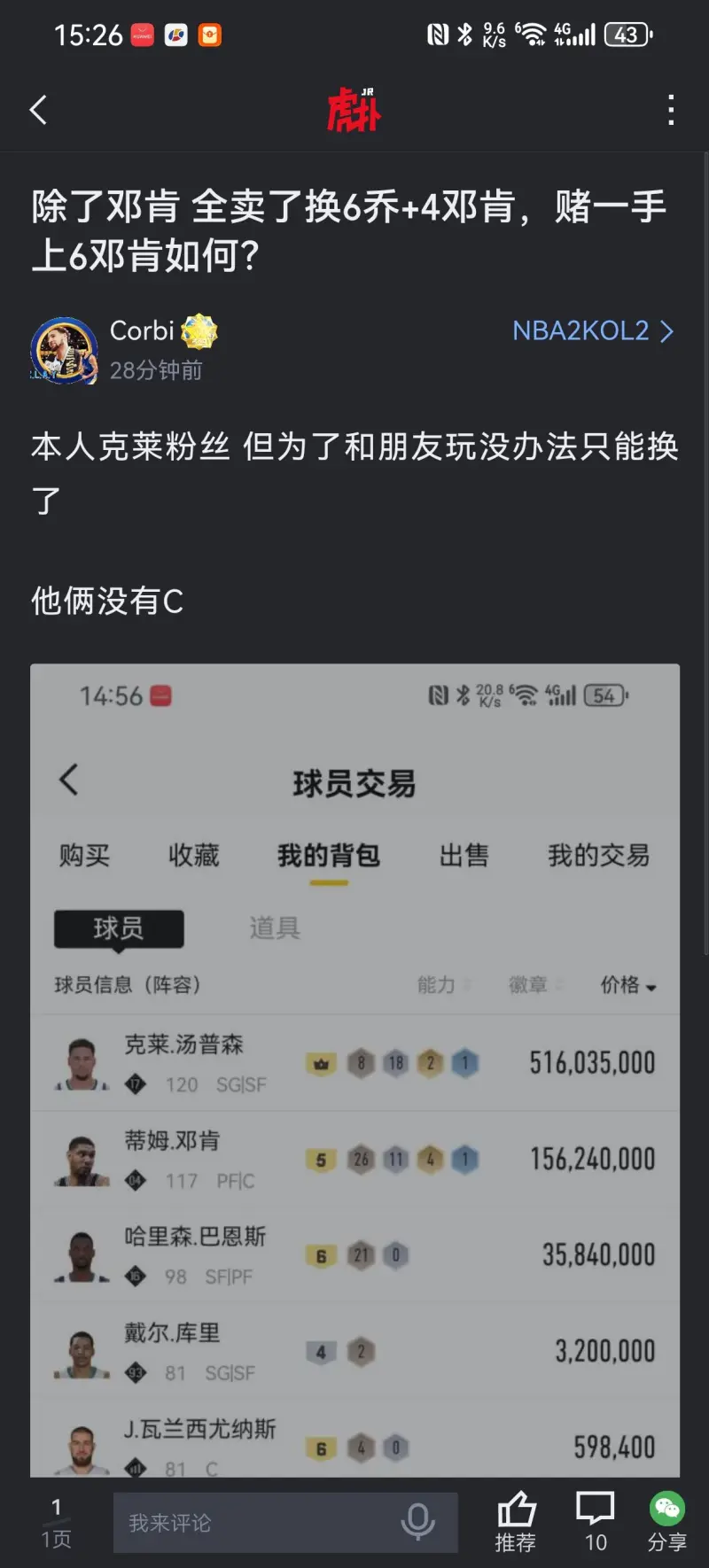我雖然克萊nb但跟他倆沒法配合 評分太高我克萊沒法下球能斷死我 而且他倆也遭罪