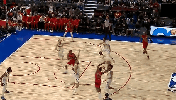 比賽的頂接第一節(jié),英格拉姆弧頂接球,球分球三分出手命中猛龍生涯首個(gè)運(yùn)動(dòng)戰(zhàn)進(jìn)球。出手