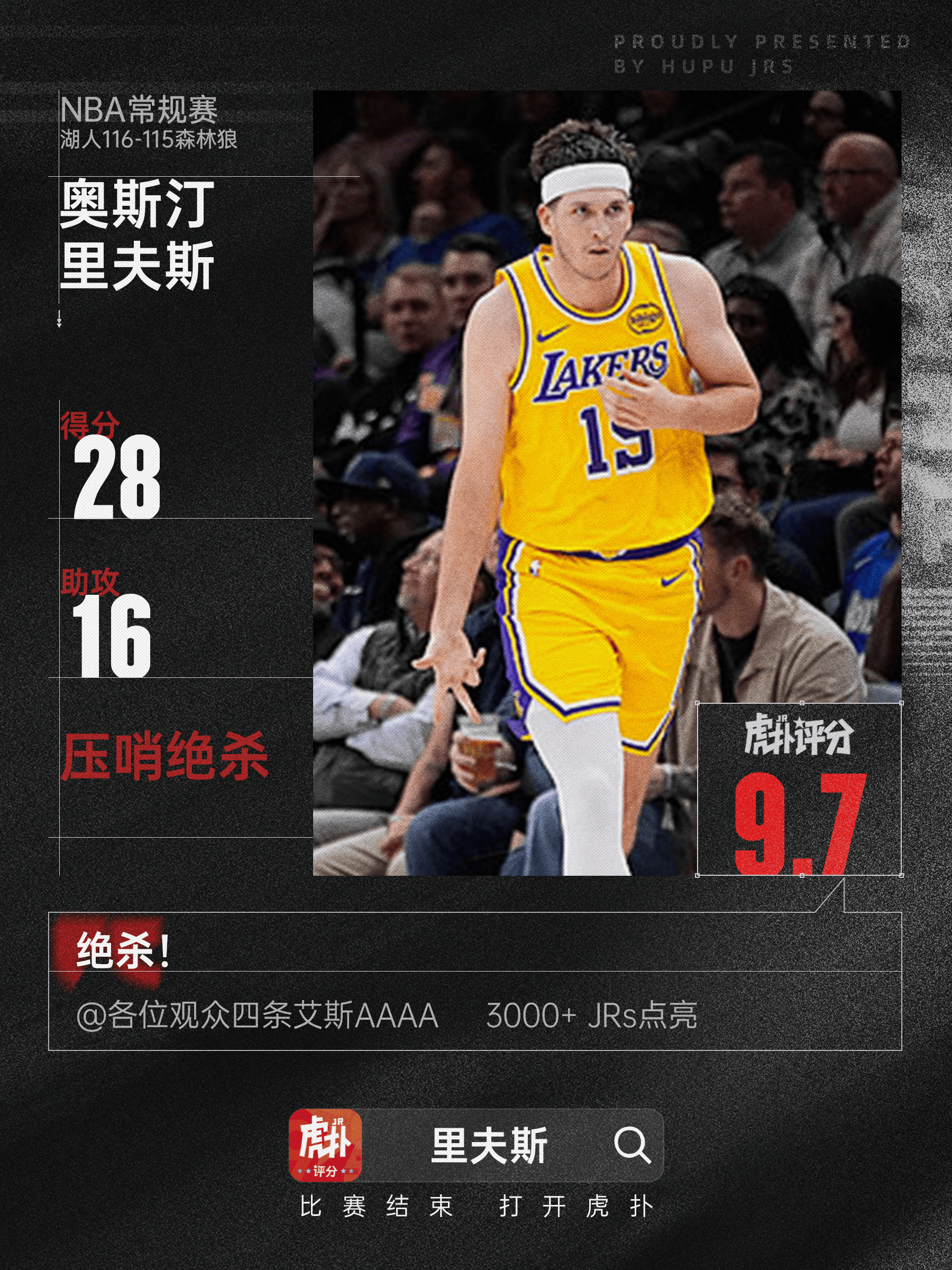 本場(chǎng)比賽,場(chǎng)砍湖人球員奧斯汀-里夫斯出戰(zhàn)39分鐘,下分23投9中,助攻其中三分球11投3中,搶斷罰球7投7中,壓哨得到28分1籃板16助攻2搶斷。絕殺