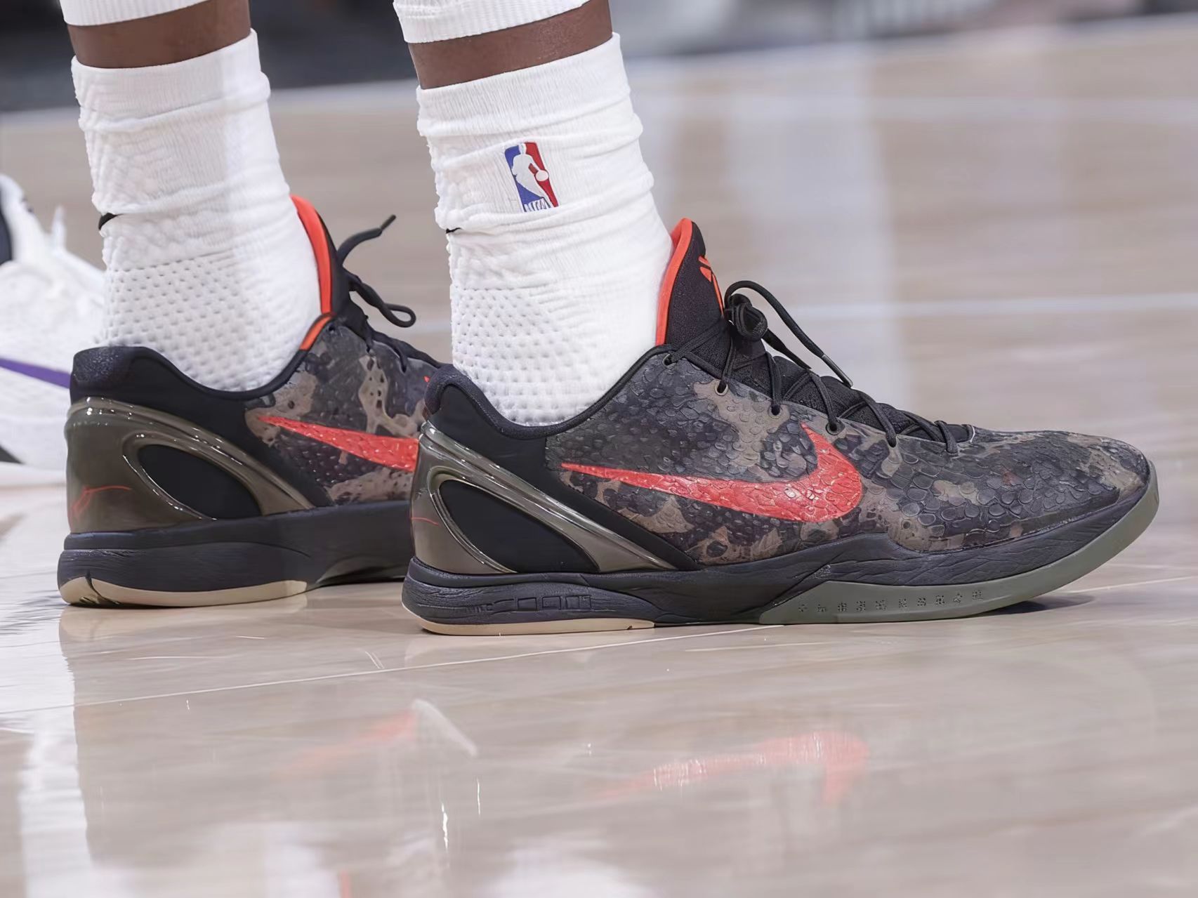 比賽中,分籃艾頓上腳意大利迷彩配色Nike Kobe 6 Protro。板艾板蓋