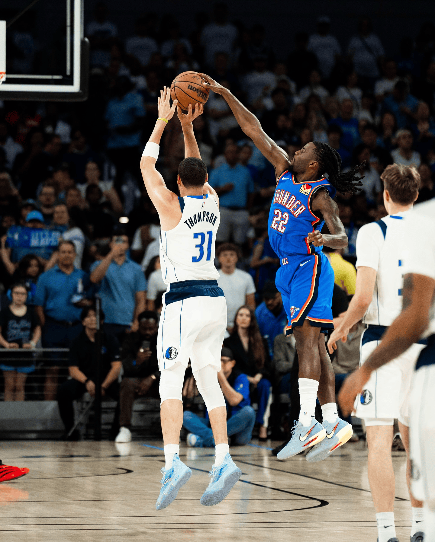 虎撲10月07日訊 雷霆官方更新動(dòng)態(tài),曬出一張今日季前賽中卡森-華萊士大帽克萊-湯普森三分的拒絕比賽瞬間。
