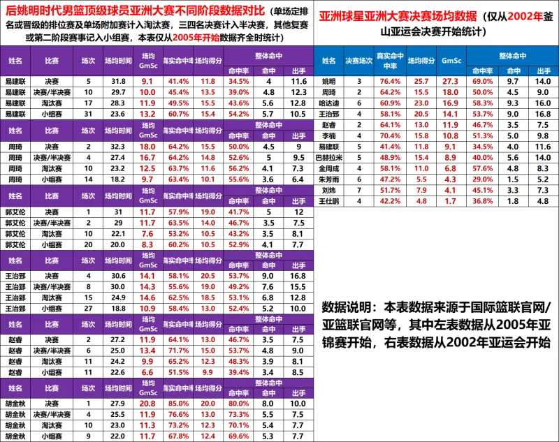 二、第二個(gè)表為后時(shí)代部分男籃領(lǐng)軍球員亞洲大賽分階段數(shù)據(jù)展示,可以看出大部分球員幾項(xiàng)重要數(shù)據(jù)反映進(jìn)攻能力的得分、命中率、和反映綜合能力的GmSc值都是隨著比賽的進(jìn)度和重要性呈決賽大于四強(qiáng)級(jí)以上比賽大于淘汰賽大于小組賽趨勢。我們知道,小組賽對(duì)手實(shí)力和比賽重要程度都不及淘汰賽,且每位球員淘汰賽和小組賽樣本都足夠高,可以合理反映各球員兩個(gè)階段個(gè)人表現(xiàn)變化。