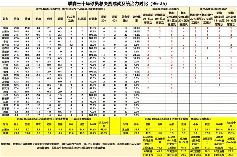 第三個(gè)表右側(cè)為球員總決賽場均數(shù)據(jù),左側(cè)為球員總決賽場均數(shù)據(jù)、總決賽次數(shù)、奪冠次數(shù)奪冠率和高分場次及占比。表一右側(cè)為球員總決賽場均達(dá)到20+得分、30+得分、gmsc值15+、gmsc值20+的屆次,以及最終奪得總冠軍時(shí)的場均20+得分、30+得分、gmsc值15+、gmsc值20+屆次,需注意這里20+得分包括30+得分,gmsc值15+包括gmsc20+。