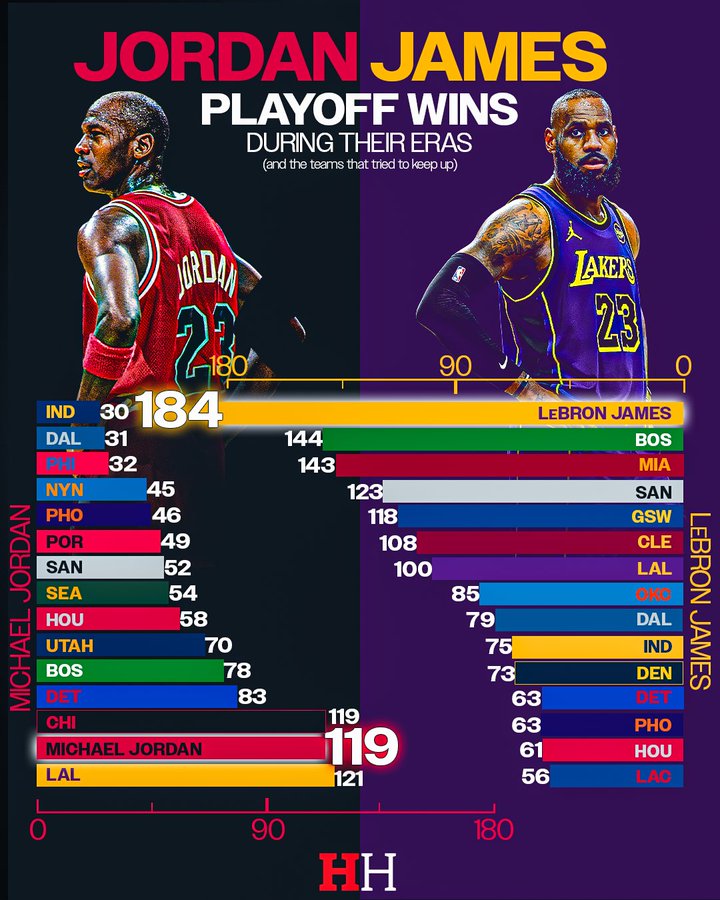 虎撲08月03日訊 今日,美媒HoopsHype更新社交媒體,板美曬出邁克爾-喬丹與勒布朗-詹姆斯各自的媒曬們各季后賽總勝場(chǎng)數(shù)。
