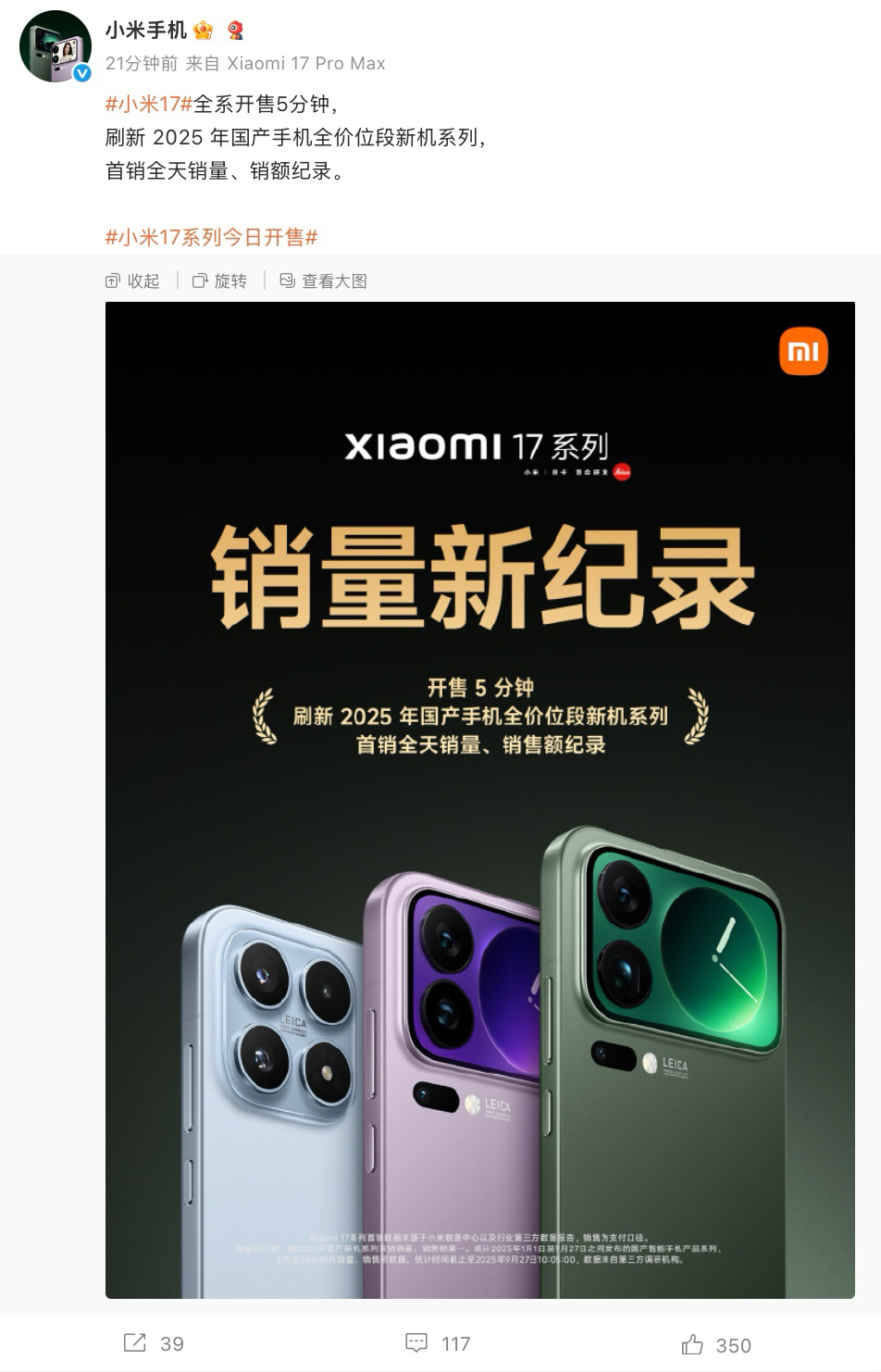 虎撲09月27日訊 小米 17 / Pro / Pro Max 手機(jī)于今天 10 點首銷,定價為 4499 元起,據(jù)小米手機(jī)官方微博,系列機(jī)型(全系)開售 5 分鐘,刷新 2025 年國產(chǎn)手機(jī)全價位段新機(jī)系列“首銷全天銷量、銷額紀(jì)錄”。