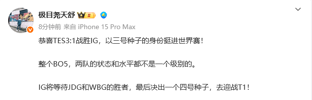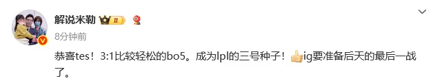 [-] 恭喜tes!3:1比較輕松的bo5。成為lpl的三號(hào)種子!ig要準(zhǔn)備后天的最后一戰(zhàn)了。 ???