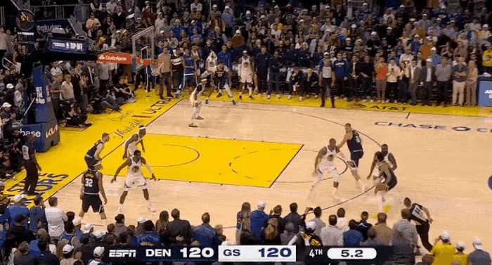 NBA常規(guī)賽,勇士對(duì)陣掘金的身拋士平比賽正在進(jìn)行中。