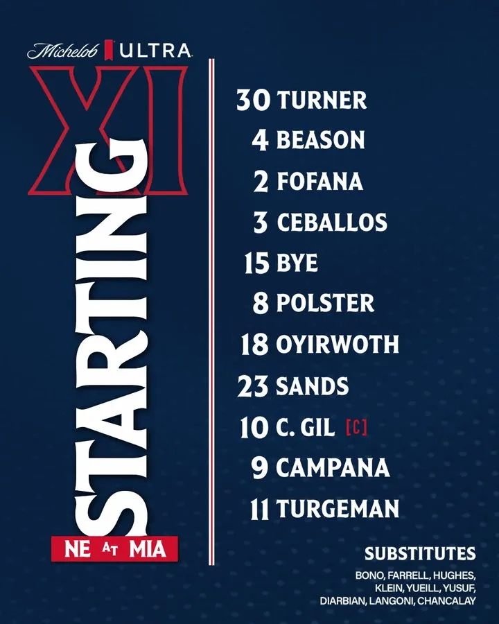 虎撲10月05日訊 美職聯(lián)第33輪,邁阿密國際主場迎戰(zhàn)新英格蘭革命,賽前,雙方公布了本場比賽首發(fā)名單。