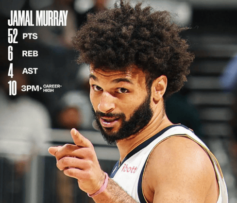 本場比賽,掘金球員賈馬爾-默里出戰(zhàn)36分鐘,投籃25投19中,其中三分球11投10中,罰球5投4中,得到52分6籃板4助攻1搶斷。