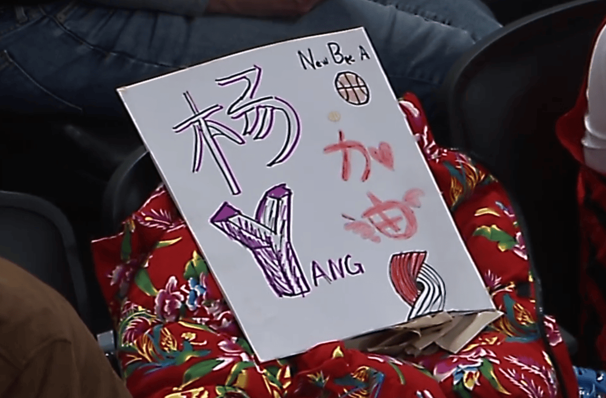 賽中,援標語上楊瀚油據現場畫面顯示,板中有中國球迷攜帶道具應援楊瀚森,國球標語上寫著“楊瀚森加油!迷現”