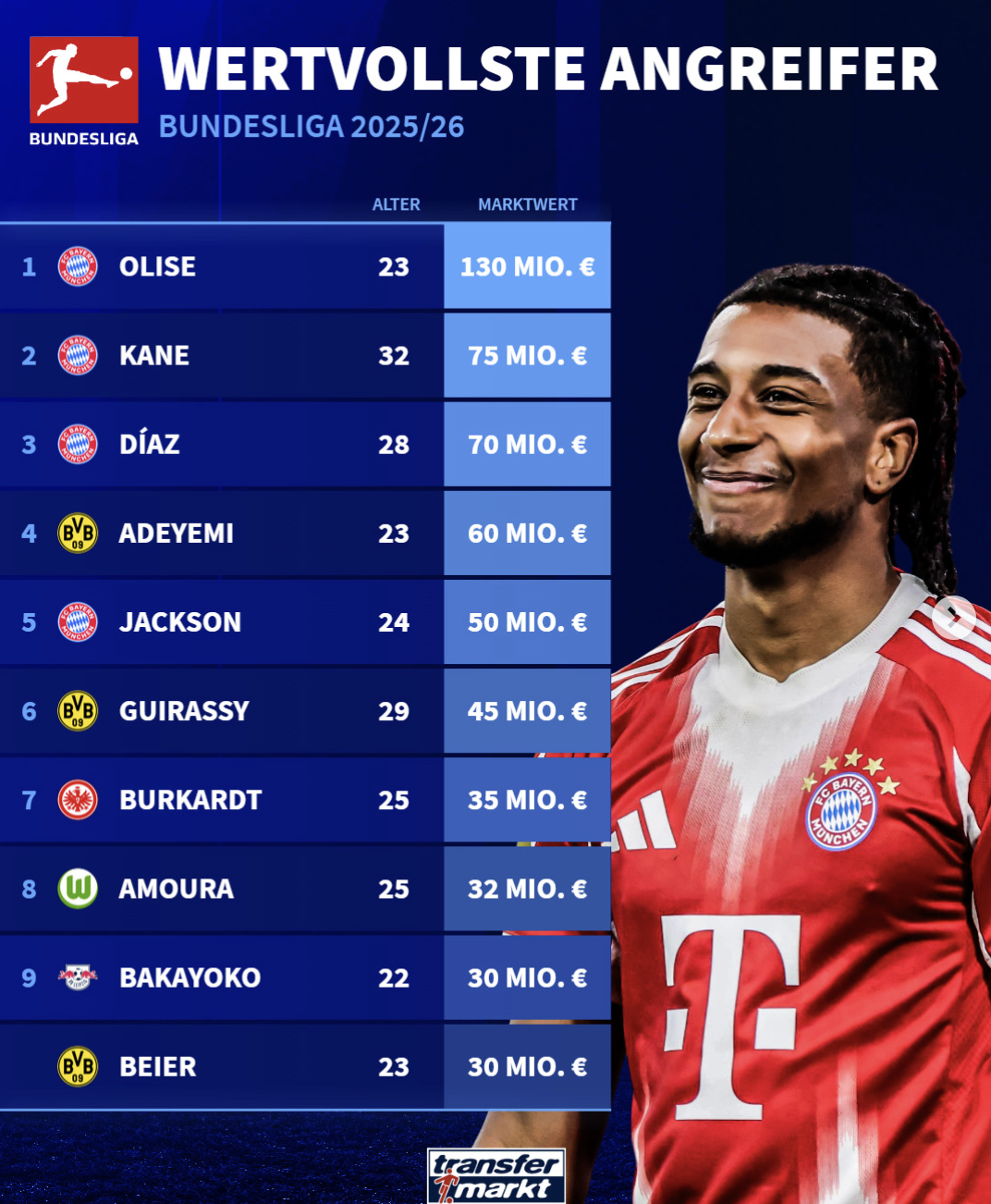 [流言板]本季德甲進(jìn)攻球員身價(jià)榜:奧利塞、凱恩和迪亞斯位列前三