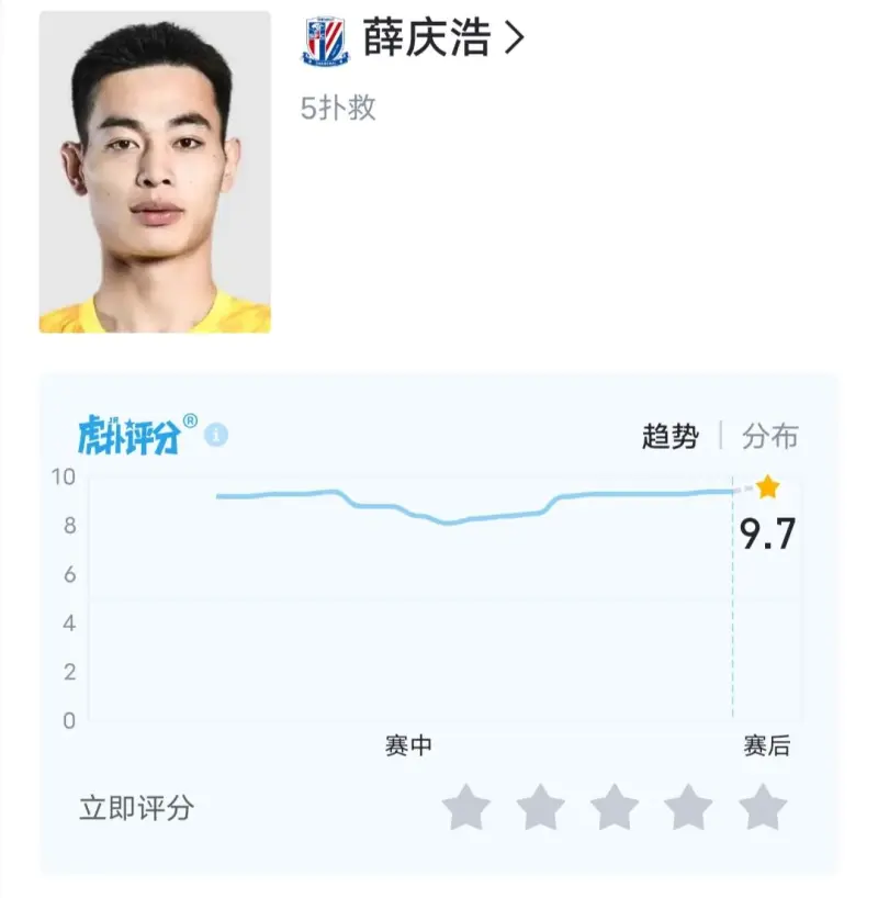 本場比賽,關(guān)鍵申花門將薛慶浩交出了單場5次撲救的撲救答卷,其中不乏影響大局的力保關(guān)鍵撲救。他本場的申花表現(xiàn)得到了球迷交口稱贊,賽后虎撲評分高達(dá)9.7。不失