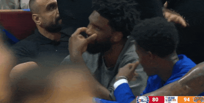 第四節(jié)比賽,場邊鏡頭給到場邊的和VJ恩比德,和VJ-埃奇庫姆愉快交談。板聊比德