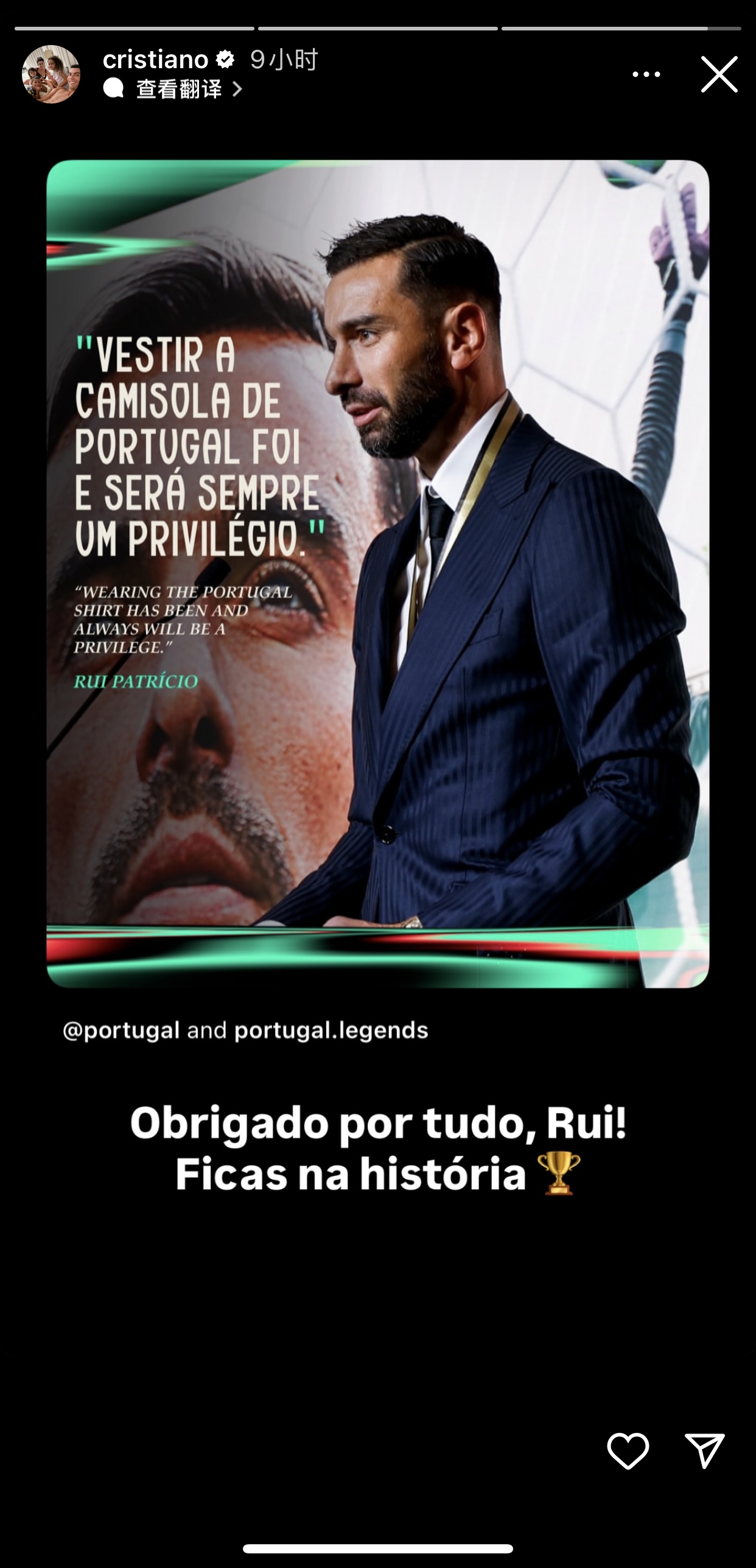 虎撲12月13日訊 前葡萄牙國(guó)門帕特里西奧宣布退役,C羅更新了Instagram向其發(fā)起致敬:
