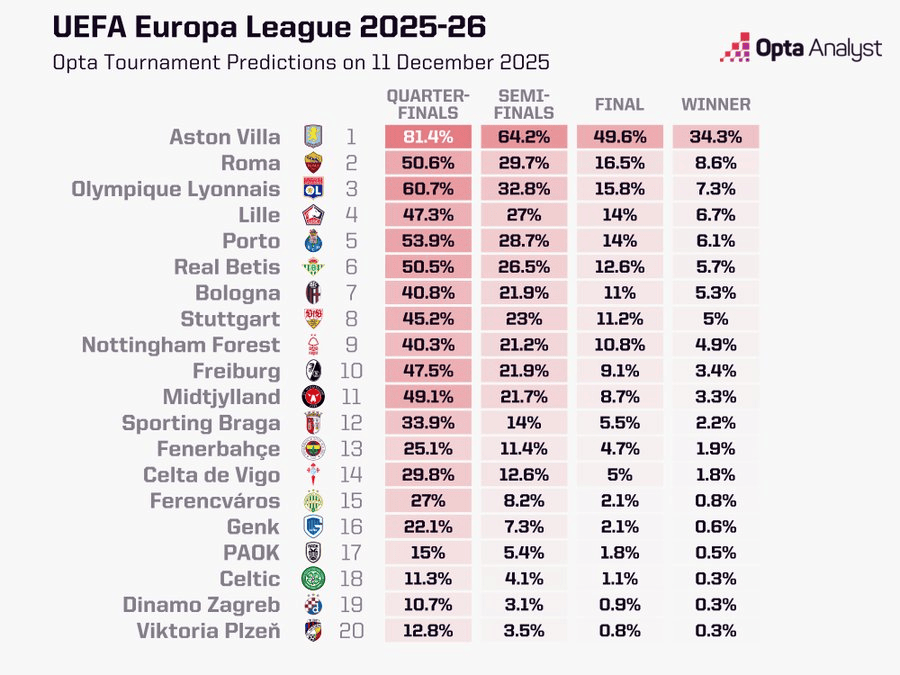 [流言板]OPTA列歐聯(lián)奪冠概率:維拉34.3%超級(jí)斷層領(lǐng)跑,第二羅馬8.6%