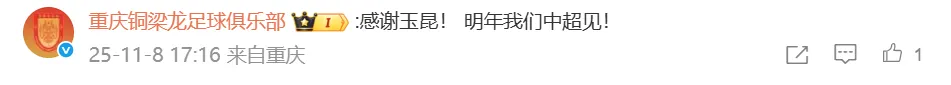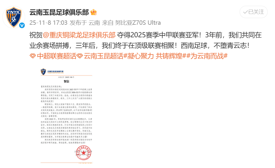 賽后,發(fā)文中超球隊云南玉昆發(fā)文祝賀重慶銅梁龍奪得亞軍,祝賀重慶在業(yè)余賽場拼搏后,銅梁兩隊在頂級聯(lián)賽相聚。超成