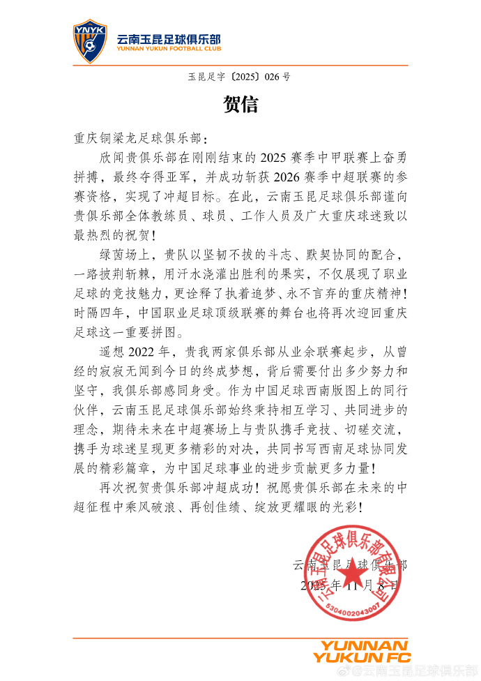 [流言板]都始于業(yè)余賽場!云南玉昆官方發(fā)文祝賀重慶銅梁龍沖超成功