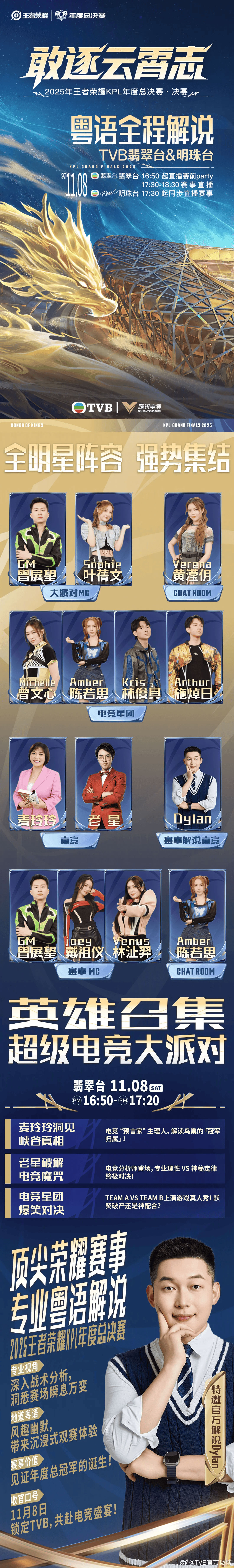 虎撲11月08日訊 TVB官宣轉播年總決賽:王牌解說Dylan粵語講解,原文如下: