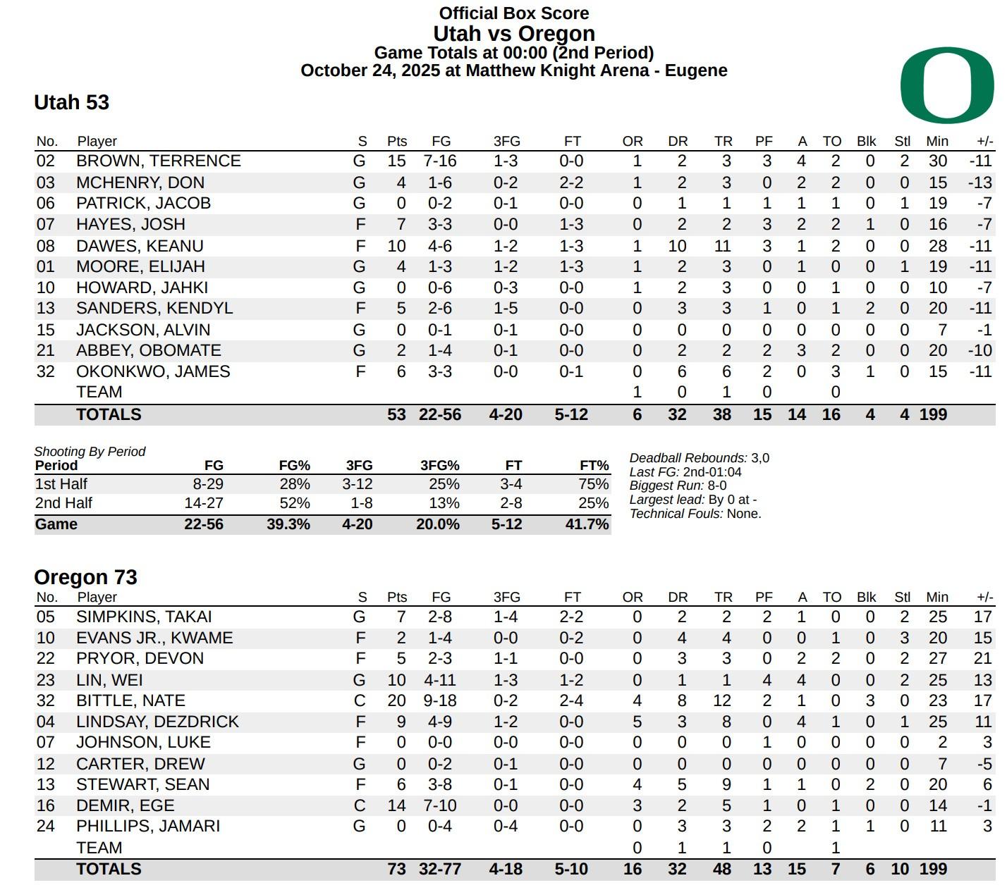 虎撲10月25日訊 NCAA熱身賽:俄勒岡大學(xué)73-53戰(zhàn)勝猶他大學(xué)。