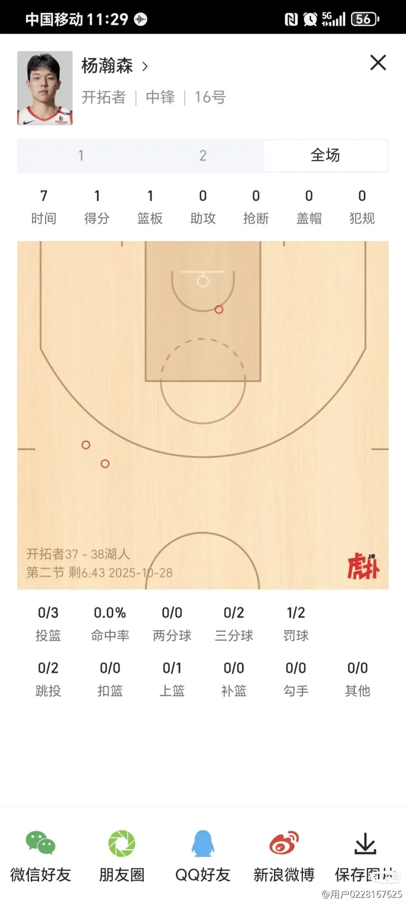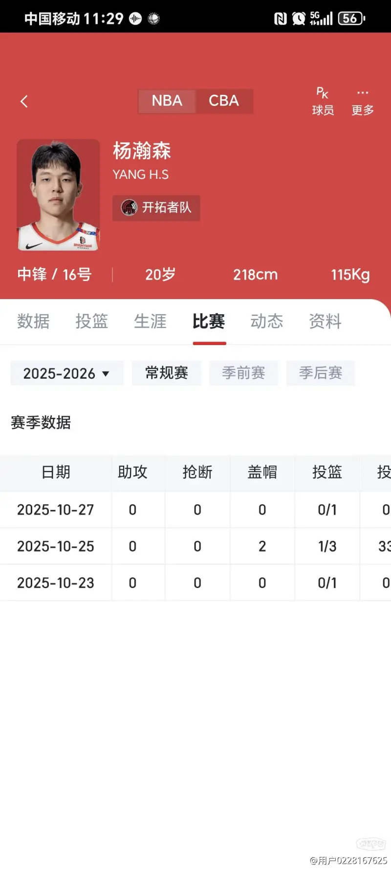 第一場(chǎng)0/1,第二場(chǎng)1/3,投籃天打第三場(chǎng)0/1,中今今天又是分鐘0/3,罰球也不準(zhǔn),楊瀚又中難怪人家教練不讓上