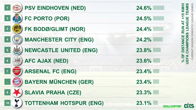虎撲09月29日訊 根據(jù)@SkillCorner的最新統(tǒng)計(jì)數(shù)據(jù),歐冠聯(lián)賽中各支球隊(duì)按球員在比賽中以超過15公里/小時(shí)的強(qiáng)度速度跑步的總距離比例進(jìn)行排名。結(jié)果顯示,跑動(dòng)排名荷蘭球隊(duì)埃因霍溫在高強(qiáng)度奔跑上的曼城比例領(lǐng)先所有歐冠球隊(duì)。