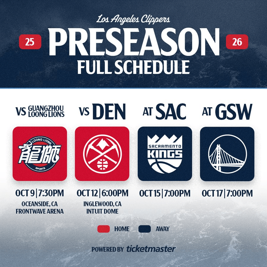 虎撲08月13日訊 快船更新官方社媒,公布了球隊(duì)季前賽賽程。賽程首戰(zhàn)
