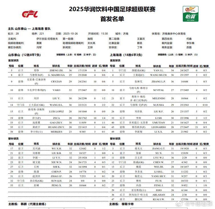 虎撲10月26日訊 中超第28輪,山東泰山vs上海海港將于15:30開戰(zhàn),科張賽前雙方公布了首發(fā)名單。翔出
