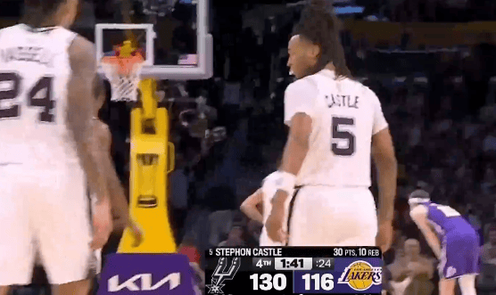 第四節(jié)比賽中,鎖定勝局卡斯爾關鍵三分投進砍下30分,卡斯砍下馬刺領先湖人14分鎖定勝局。爾關