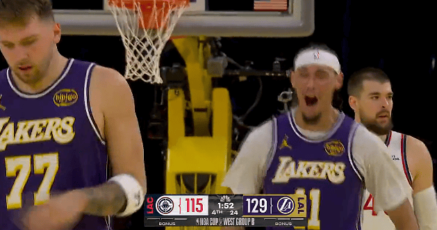 虎撲11月26日訊 NBA杯小組賽,湖人對(duì)陣快船的鐘領(lǐng)比賽正在進(jìn)行中。