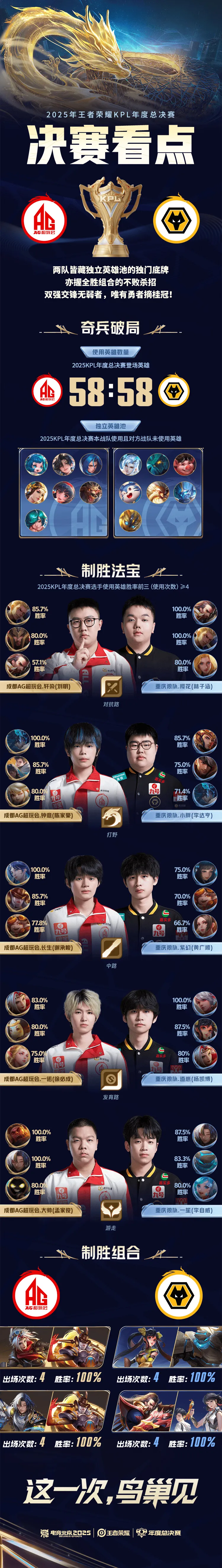 【奇兵破局】雙方在2025年KPL年度總決賽均登場(chǎng)58個(gè)英雄,并擁有7個(gè)英雄的獨(dú)立英雄池。