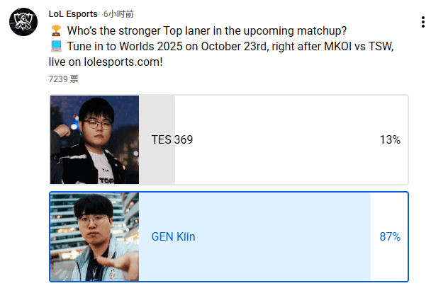 [流言板]誰將贏下今日上路對決?LOL官方投票:87%人認為Kiin強于369