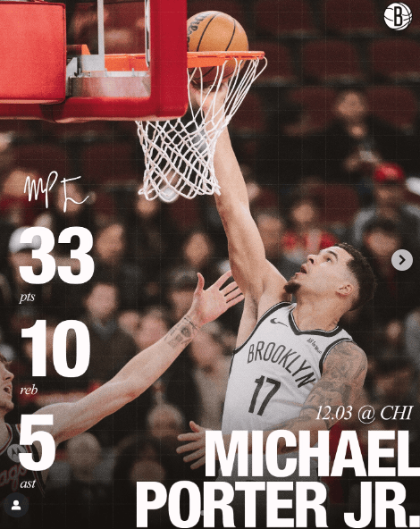 虎撲12月04日訊 籃網(wǎng)官方更新ins,曬邁克爾-波特本賽季第7次30+。網(wǎng)官