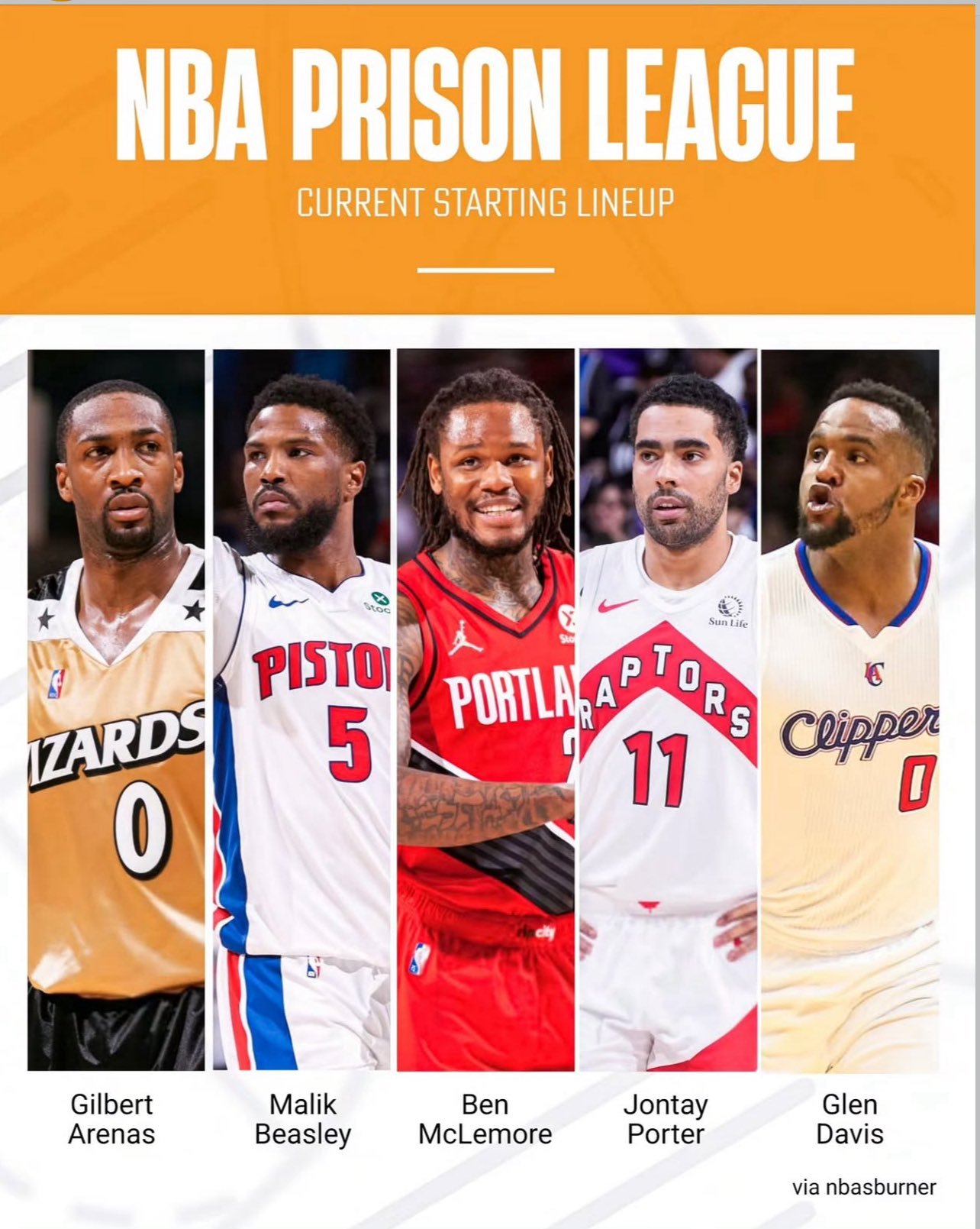 虎撲07月31日訊 今日,媒體NBA Memes曬出了一張“入獄”五人組的曬入首發(fā)陣容,并配文調(diào)侃: