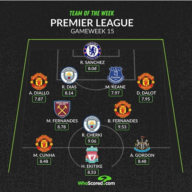 虎撲12月09日訊 英超第15輪的比賽全部結(jié)束,WhoScored盤點(diǎn)本輪評分最高陣容: