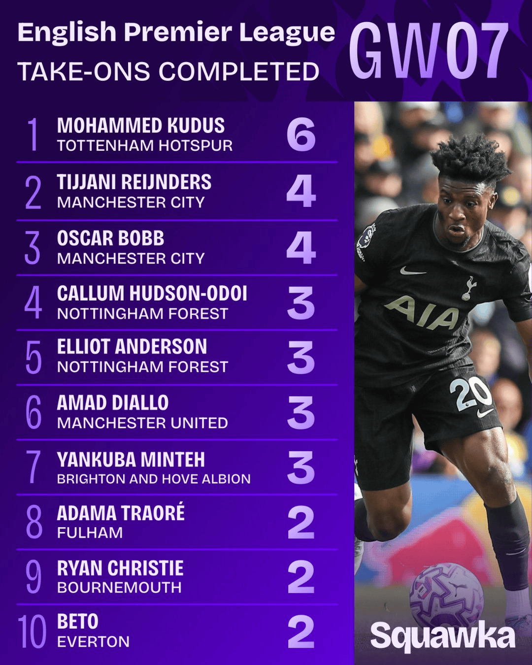 來源:X虎撲10月06日訊 數(shù)據(jù)網(wǎng)站squawka統(tǒng)計了本輪英超的相關數(shù)據(jù)。在過人榜上,人數(shù)熱刺攻擊手庫杜斯位列榜首。最多