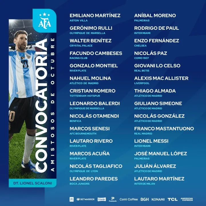 后衛(wèi):蒙鐵爾(河床)、大名單梅莫利納(馬德里競(jìng)技)、西領(lǐng)銜恩羅梅羅(托特納姆熱刺)、佐勞巴列爾迪(馬賽)、塔羅奧塔門(mén)迪(本菲卡)、瓦雷塞內(nèi)西(伯恩茅斯)、斯列里維羅(河床)、根廷阿庫(kù)尼亞(河床)、塔利亞菲科(里昂)