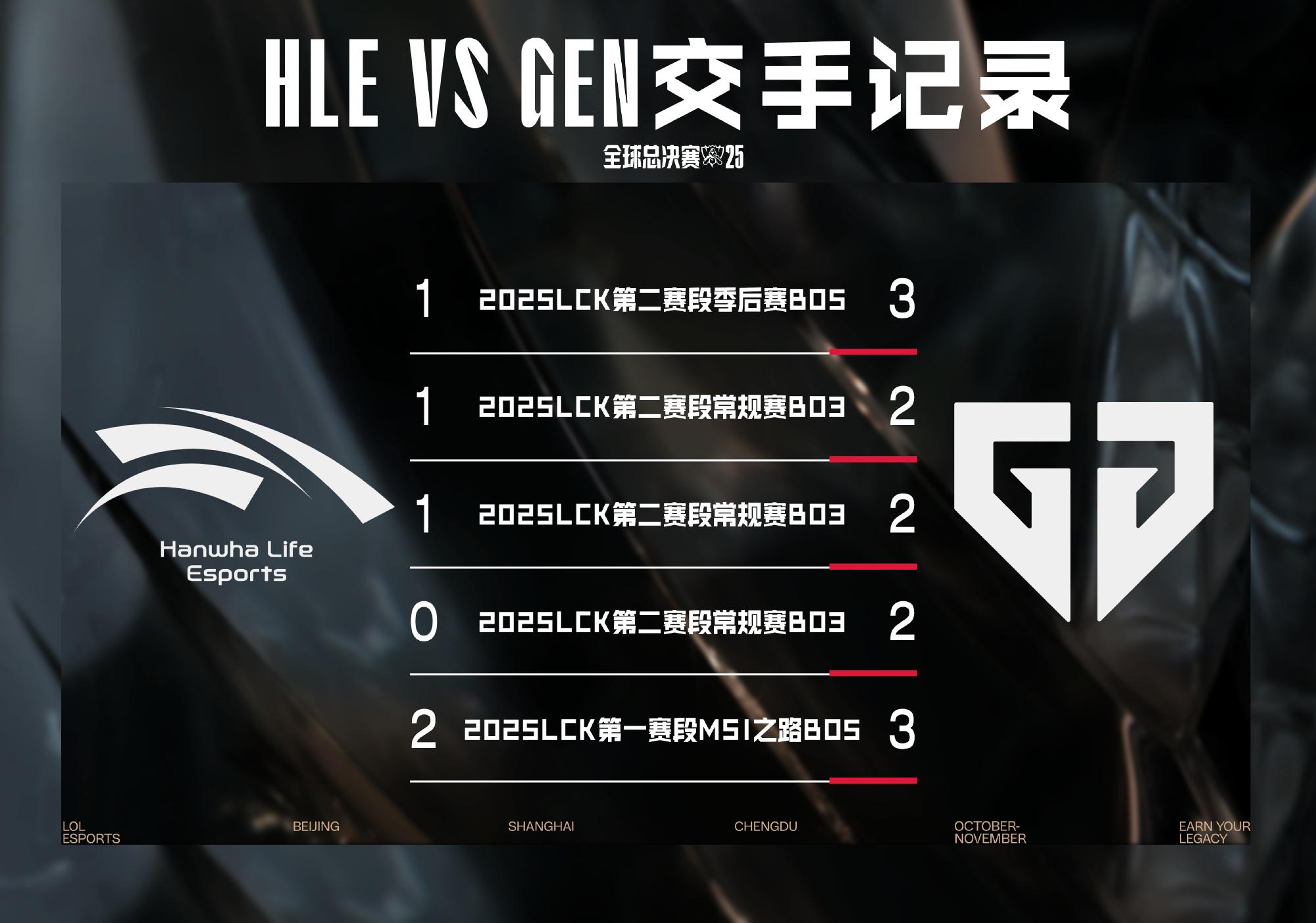 虎撲10月28日訊 2025全球總決賽淘汰賽1/4決賽GEN對(duì)戰(zhàn)HLE 數(shù)據(jù)前瞻: