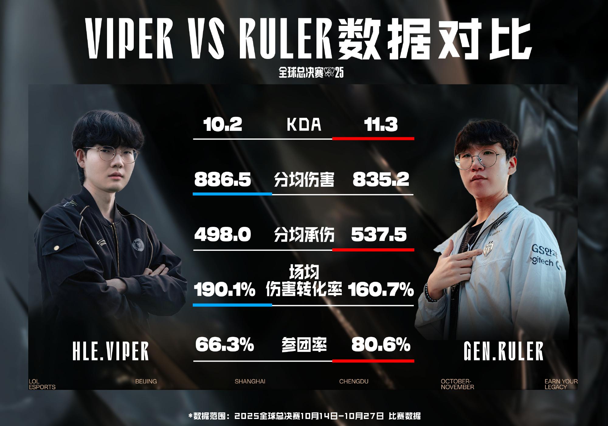 Viper對(duì)戰(zhàn)Ruler數(shù)據(jù)對(duì)比:Viper以886.5的瞻近N戰(zhàn)分均傷害 + 190.1% 的場均傷害轉(zhuǎn)化率領(lǐng)先;而Ruler憑借11.3的KDA + 537.5的分均承傷 + 80.6%的參團(tuán)率領(lǐng)先。
