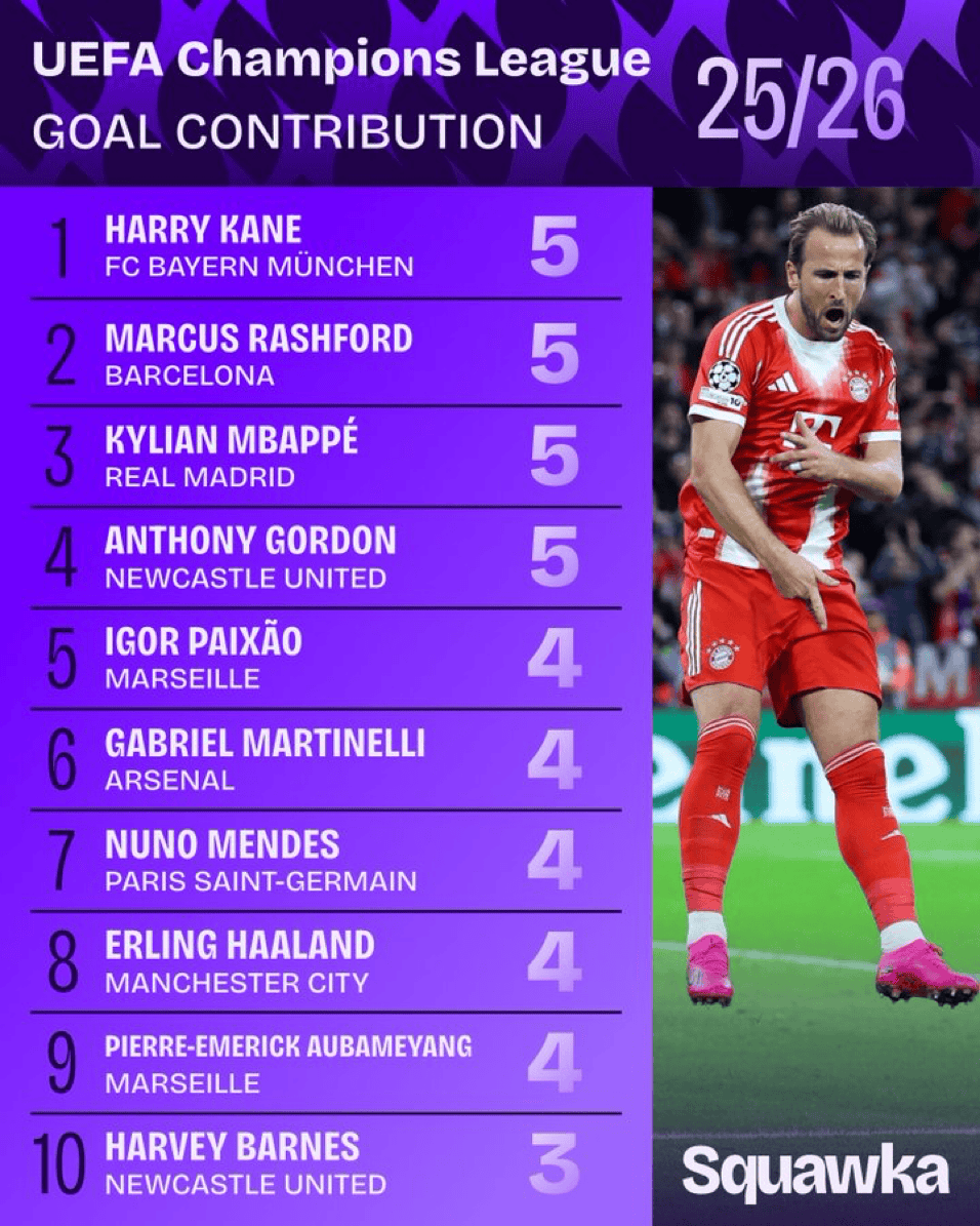 虎撲10月24日訊 根據(jù)Squawka的統(tǒng)計,本賽季的歐冠歐冠聯(lián)賽里,有四名球員直接參與了5個進球: